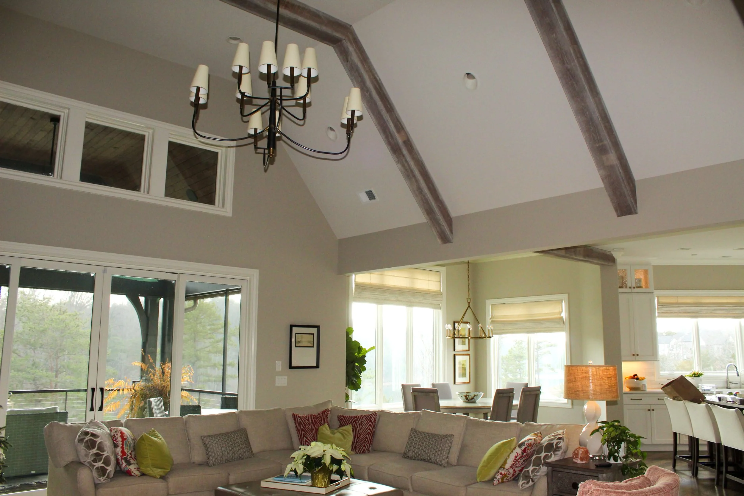 This elegant home blends timeless European charm with modern craftsmanship, highlighted by a striking stone façade, steep rooflines, and warm wood accents. An arched entryway and expansive windows create a welcoming presence while filling the interior with natural light.
